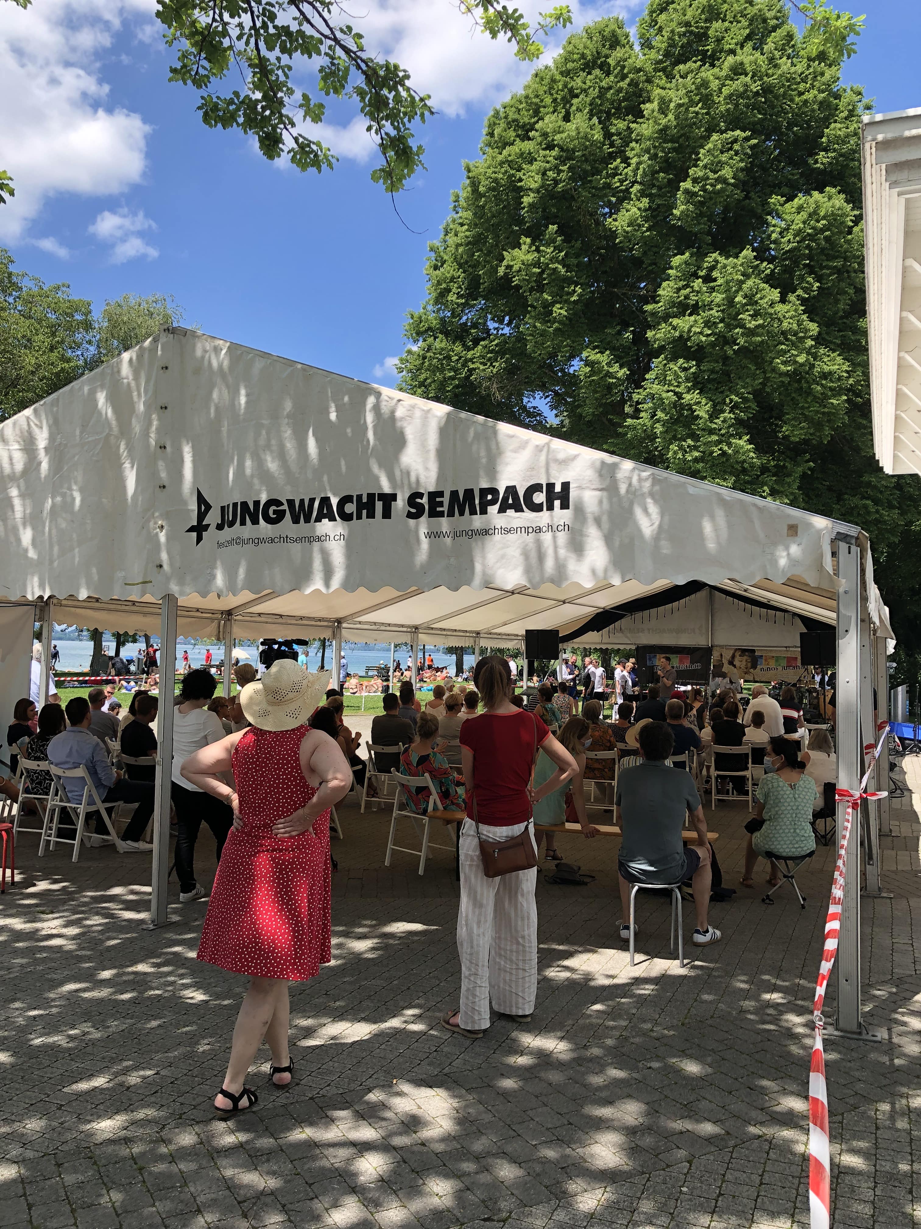 Bilder vom Festzelt (ohne Seitenwände im Bild) vom Leise Töne Event 2021 vor der Festhalle.